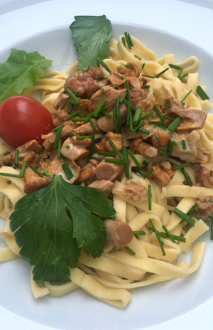 Die Pfifferlinge kredenzte Anja in einer leckeren Sahnesauce mit Bandnudeln (2. Foto rechts). Dazu gab es einen frischen Gartensalat.
