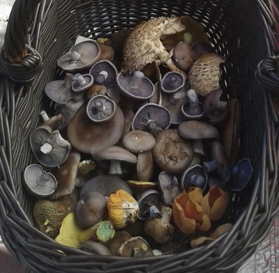 Foto links: Wer solch einen Korb schöner Herbstpilze sammelt, ist wahrlich kein Anfänger mehr. Parasolen, Violette Rötelritterlinge und zwei Ziegenlippen unten links sind erkennbar. Und rechts unten hat Alexander einige Eselsohren deponiert.