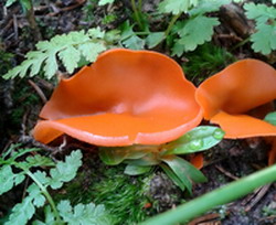 Die gezeigten Pilze sind (von oben): Fleischroter Speisetäubling, Orangeroter Becherling, Sommersteinpilz.