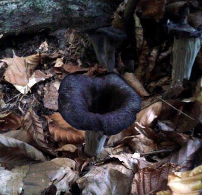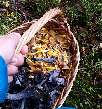 Überall standen Büschel mit gelbbraunen Trompetenpfifferlingen und Herbsttrompeten. Nach zwei Stunden war mein Korb ganz voll und ich bin glücklich nach Hause.