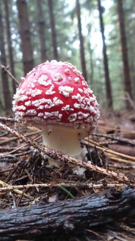 Foto: Ein schmucker Fliegenpilz mit fast tastbaren weißen Flecken. Er und seine Artgenossen standen in großer Zahl und verstärkten die Farbenpracht des Herbstwaldes noch.
