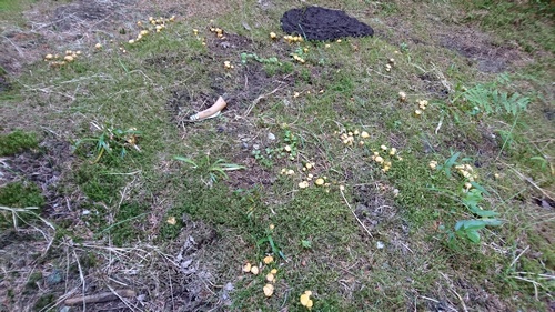 Unsere Kletterparie in den steilen Wäldern wurde dennoch belohnt Die Pfifferlinge lassen sich an feuchten Stellen im Wald schon sehen, zwar noch sehr winzig, aber dafür teilweise in »Hülle und Fülle«.