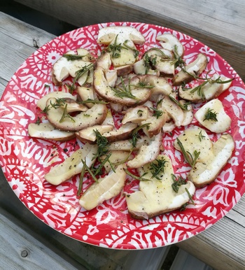 Steinpilzcarpaccio mit geröstetem Thymian und Rosmarin daraus