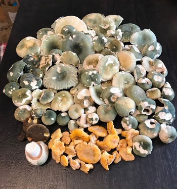 In knapp zwei Stunden habe ich erneut eine tolle Ausbeute an diversen Täublingen gemacht inkl. zwei Grünfelderigen. In der Überzahl waren klar Grüne Speisetäublinge, dazu gab es Fleischrote und wenige Frauentäublinge. Eine Handvoll Pfifferlinge fand ich ebenfalls (Foto rechts).