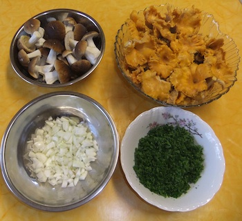 Foto rechts: Schalen und Schüssel mit den wichtigsten Zutaten stehen bereit, der eigentliche Kochgang ist somit prima vorbereitet: Steinpilze, noch ungeschnitten, Pfifferlinge, Zwiebeln und die Petersilie warten auf ihren Einsatz. (3 Fotos © Margit)