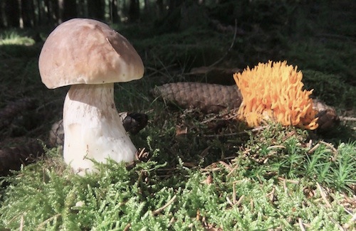 Foto: Ein Klebriges Hörnchen Seite an Seite mit einem Steinpilz. Diese Korallenpilze sind typisch für moosige Fichtenwälder. (3 Fotos © Margit)