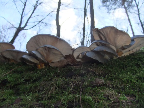 Foto: So prächtige Austernseitlinge im guten Wachstumsstadium! Der große im Vordergrund maß 22 Zentimeter im Durchmesser. Sie sind hervorragend für gehobene Winterpilzspeisen.