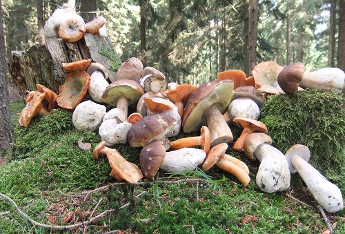 Foto: So sieht die heutige Ernte von Margit und Olli aus. Fichtenreizker suchen die Gesellschaft der herrlichen Steinpilze. (4 Fotos © Margit Lindemann)