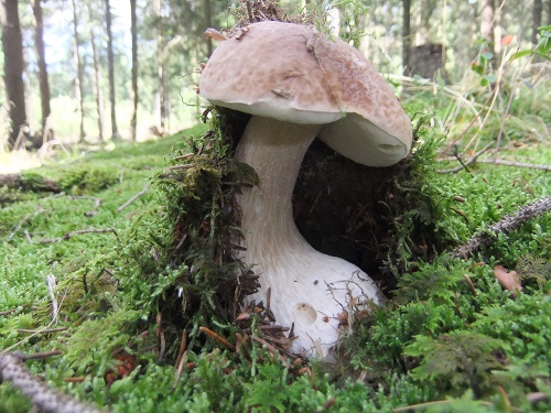 Bei heiterem Himmel machte das Pilzesuchen großen Spaß, zumal wir mit schönen knackigen Steinpilzen belohnt wurden. Wir konnten teilweise dem bemoosten Waldboden bei der Geburt von herrlichen jungen Steinpilzen behilflich sein, indem wir sie von ihrer Nabelschnur, ihrem Wurzelgeflecht (Myzel), vorsichtig mit unseren Messern trennten.