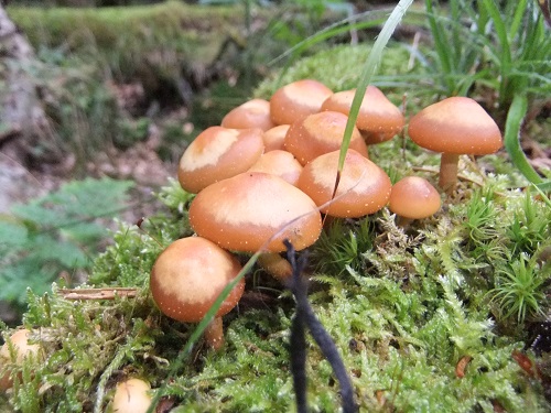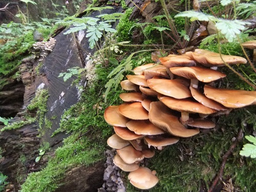 Auf einem bemoosten Baumstumpf entdeckte ich noch eine kleine Kolonie der köstlichen Stockschwämmchen, deren Stiele sehr wichtig zur Bestimmung und damit zur Abgrenzung gegen die tödlichen Gift- oder Nadelholzhäublinge sind.