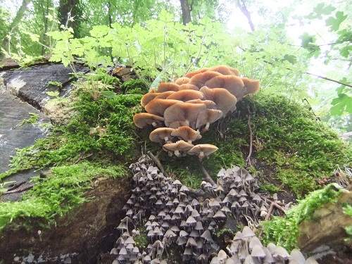 Foto: Das gleiche Büschel Stockschwämmchen wie oben. Dieses Mal hat Margit aber auch die Gesäten Tintlinge mit ins Visier genommen. Sie sind keine Speisepilze. (2 Fotos © Margit Lindemann)