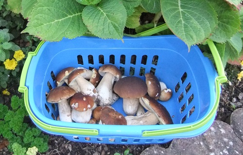 Foto: Die Steinpilze hat Sohnemann Marco gefunden. Für ein Foto hat Margit sie in einem Kräuter- und Blumenbeet präsentiert. (Foto © Margit)
