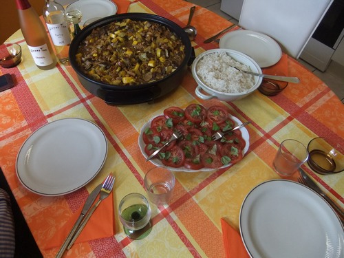 Heute Mittag waren mein Freund »Winzer Tom« und seine Frau Gudrun bei uns zu Gast. Wir aßen eine herrliche Pilzpfanne mit gelben Zucchini, dazu gab es Reis und einen Tomatenteller.
