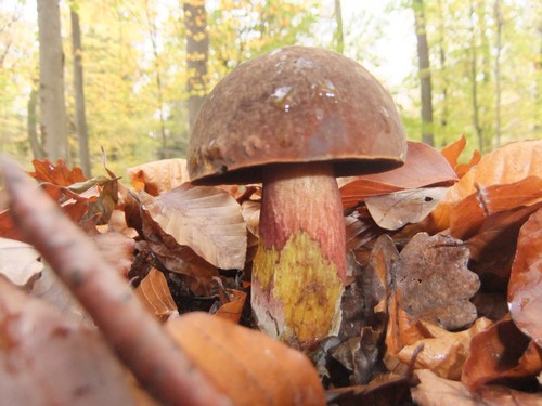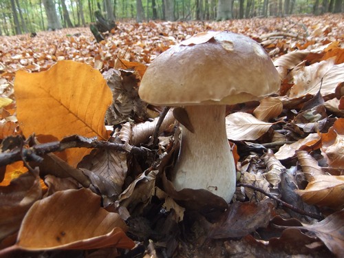 Foto: Margits erster Steinpilz-Fund des Jahres! Wer hätte gedacht, dass sie ihn erst im frisch gefallenen Buchenlaub des herbstlichen Waldes entdecken würde.