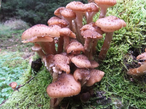 Foto: Endlich einmal wieder ein schönes Bild vom Hallimasch! An diesem Holz verzehrenden Massenpilz, der auch gesundes Nadelholz angreift, scheiden sich die Geister. Manche vertragen ihn nicht (Folge: Magen- und Darmprobleme oder grippeähnliches Krankheitsbild) oder mögen ihn nicht, für andere ist er ein guter bis sehr guter Speisepilz. Soviel steht fest: Man sollte ihn vor dem Braten bzw. der Weiterverwendung 20 Minuten lang abkochen, das macht ihn deutlich verträglicher.