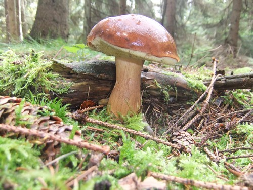 Zunächst durchsuchten wir einen durch Holzfäller vor längerer Zeit gelichteten Laubwald mit viel Moosbewuchs. Hier entdeckten wir einige größere Fichtenreizker und hin und wieder einen einzelnen Hexenröhrling.