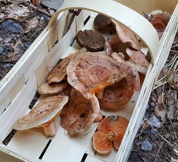 Fichtenreizker und jeweils zwei Perlpilze und Hexenröhrlinge landeten in unserem Körbchen.