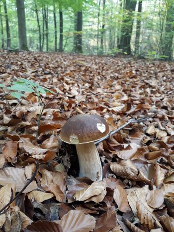 Foto: Auch dieses Bild - mit drei Steinpilzen - vermittelt einen guten Eindruck vom Typus der Waldlandschaft, in der Markus' Steinpilze wachsen. Es ist auch ein Lehrstück darüber, wie spät beste Steinpilze auch im Laubwald noch erscheinen können. Selbst manchen erfahrenen Pilzsammler erstaunt das.