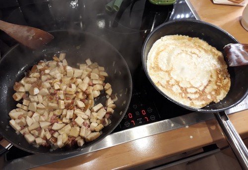 Foto: In der Pfanne links brutzeln die Steinpilzstückchen zusammen mit Speck, rechts wartet der Pfannkuchenteig schon auf die ersehnte Füllung. Wer möchte da nicht mitessen?