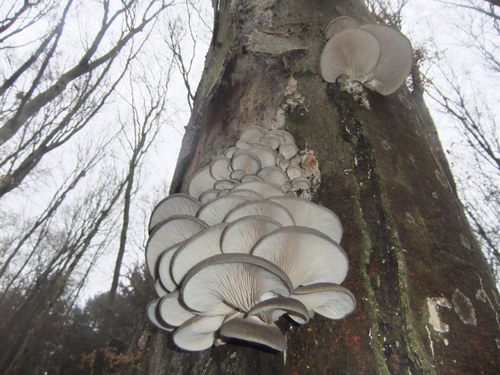 Foto: Margit und Olli waren mit diesem Fund von Austernseitlingen mehr als zufrieden. Das feuchtkalte Wetter begünstigt ihr Wachstum und verspricht zusätzliche Ernten.