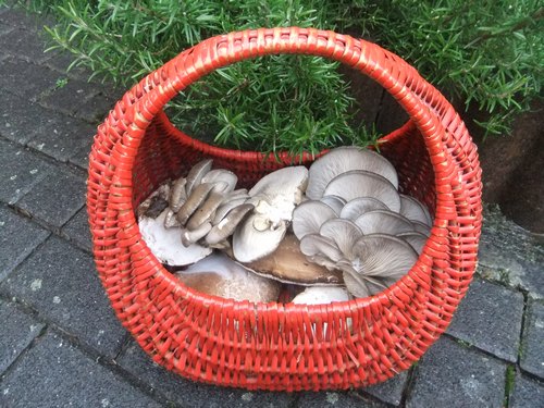 Foto: Die Birkenporlinge liegen unten und dienen den empfindlicheren Austernseitlingen beim Abtransport als Polster. Und der bekannte rote Korb von Margit und Olli kommt in voller Lebensgröße auch einmal wieder zu Ehren.