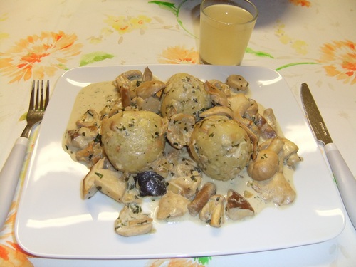 Foto: Hinterher ließen es sich Margit und Oliver schmecken. Es gab eine Pilzpfanne mit Semmelknödeln, dazu Federweißen. Margit entschied sich, wie hier zu sehen, für den Weißen.