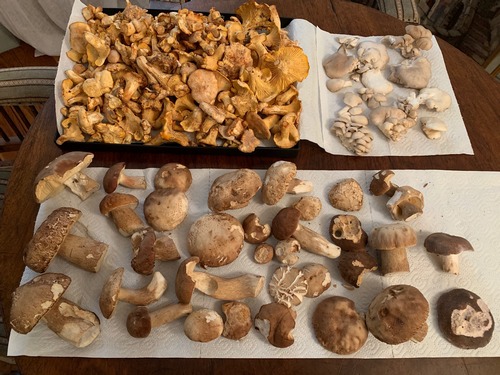 Foto: Verschiedene Arten Pfifferlinge, rechts daneben Lungenseitlinge sowie Sommersteinpilze unterschiedlicher Größe und Qualität fand Rolf bei Landau/Klingenmünster.
