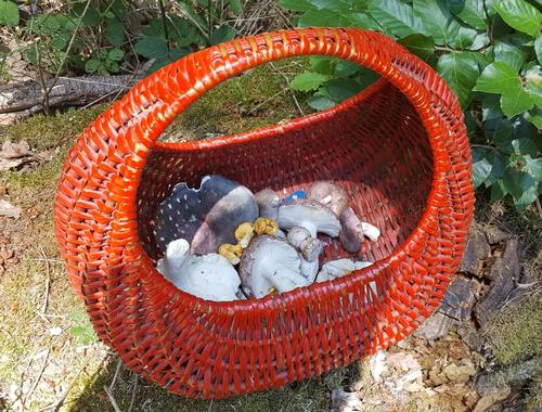Foto: Zugegeben, man hat den bekannten roten Korb von Margit und Oliver schon besser gefüllt gesehen. Dennoch dürfte es mit diesem Fund aus dem Bad Kreuznacher Rheingrafenwald für eine Pilzpfanne gereicht haben. (2 Fotos © Margit)
