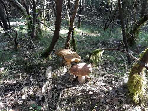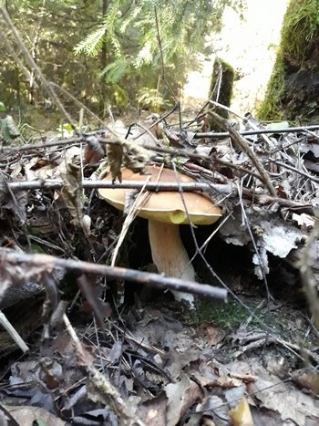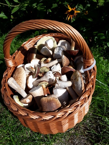 Einige Steinpilze hatten sich jedoch gut genug versteckt und wanderten neben wenigen Birkenpilzen und Maronen in meinen Korb, der am Ende meiner Tour wieder richtig gut gefüllt war (Foto rechts).