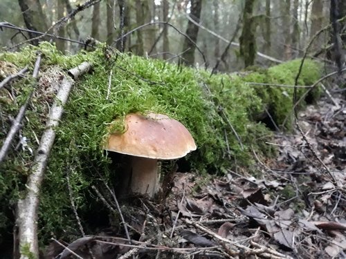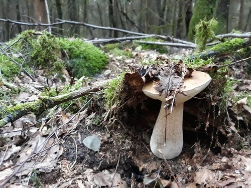 Foto: Dieser Steinpilz drückt sich wie Schutz suchend an einen hingestreckten übermoosten Baumstamm.
