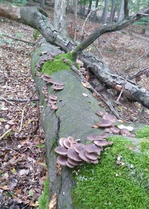 Danach besuchte ich noch den Rheingrafenwald, denn dort hatte ich unlängst noch einen einen Wirtsbaum von Lungenseitlingen entdeckt. Als ich dort ankam, traute ich meinen Augen nicht: der liegende Baum war reichlich besetzt mit frischen Austernpilzen (3. Foto rechts) - außergewöhnlich früh für unsere Region. Was für mich bedeutet, dass ich ab sofort regelmäßig ein Auge auf allen mir bekannten Nestern haben muss, um ihren Reifepunkt nicht zu verpassen.