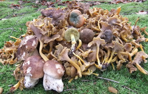 Foto: Steinpilze, Fichtenreizker, Ziegenlippe und Maronenröhrling im Gewusel von Trompetenpfifferlingen. Das Foto entstand, bevor Margit und Olli noch weitere Steinpilze fanden.