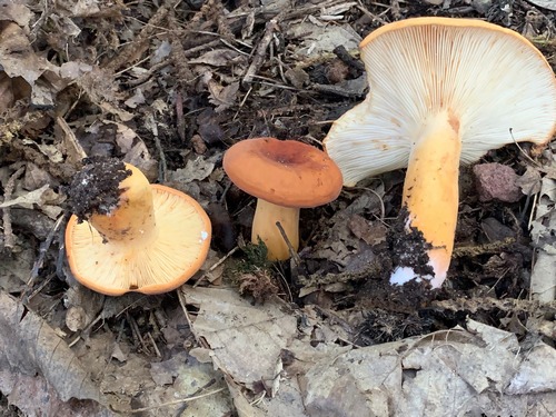 Neu ist für mich der Samtige Pfifferling, den ich aufgrund seiner intensiven orangenen Farbe zunächst für einen Falschen Pfifferling gehalten hatte. Er ist aber kompakter, hat einen dickeren Stiel und deutliche hellere Leisten.