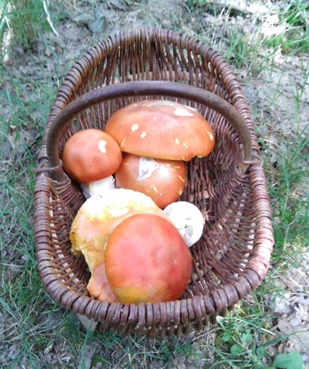 Freudig und voller Erwartung beschleunigte ich meinen Schritt. Da standen sie vor mir, die herrlichsten Kaiserlinge, jedoch an einer anderen Stelle als beim letzten Mal. Nach kurzer Zeit war der Korb schon fast voll; das war wirklich der bis dahin beste Fund feinster Kaiserlinge, in absoluter Premiumqualität.
