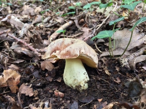 Foto: Ein Laubwaldanhängselröhrling mit unverkennbar gelblich-weißem Stiel.