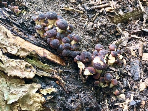Zum Schluss unserer Tour schauten wir noch an meiner Pioppino-Pappel vorbei und stellten fest, dass der Südliche Ackerling schon wieder fruktifiziert. Der ganze Stamm ist übersät mit tausenden winzig kleinen weißen Pünktchen. Auch zeigten sich schon wieder einige Fruchtkörper. Wenn die gefräßigen Schnecken etwas übrig lassen, kann ich in den nächsten Tagen wieder mit einer ordentlichen Ernte rechnen.