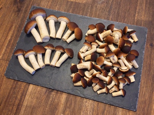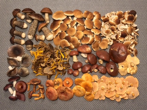 Foto: Ein zusammengenommener Fund aus Rülzheim und Karlsruhe. Die länderübergreifende Pilzsuche brauchte Thomas auch diesmal einen schönen Fund zusammen. (6 Fotos © Thomas)