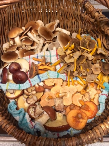 Foto: Die Schnecken waren sichtlich schon da, doch zu Norberts Freude waren die Maronenröhrlinge allesamt wurmfrei. Rechts im Korb liegen die Rauchblättrigen Schwefelköpfe. (Foto © Norbert)