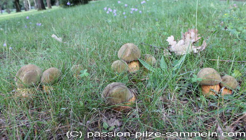 Foto: Willkommenes Nest von Netzstieligen Hexenröhrlingen, gefunden am 18. Juli 2012: Ich fand sie nicht in der Hardt, sondern am Rande eines Leipziger Friedhofes. Sie warten dort alljährlich treu und zuverlässig auf mich.
