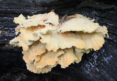 Foto: Von diesem Schwefelporling habe ich mir zwei der unteren Zungen vorsichtig abgebrochen. Sie landeten in der Pfanne - und erwiesen sich als absolutes Gourmet-Mahl. Schwefelporlinge sind, egal ob paniert oder pur gebraten, eine Delikatesse - sofern sie jung sind. Selbst dann können sie aber schwer verdaulich sein.