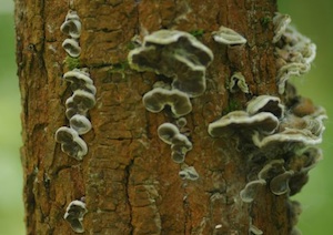 Der Gezonte Ohrlappenpilz (Auricularia mescentrica), siehe Foto links, ist für unser Gebiet eine Rarität, aber leider kein Speisepilz.