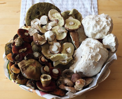 Im Korb befinden sich Sommersteinpilze, Flockenstielige und Netzstielige Hexenröhrlinge, Ziegenlippe, Rotfußröhrling, Riesenboviste, Frauentäublinge und Perlpilze.