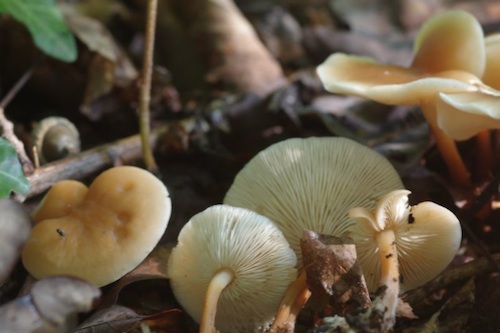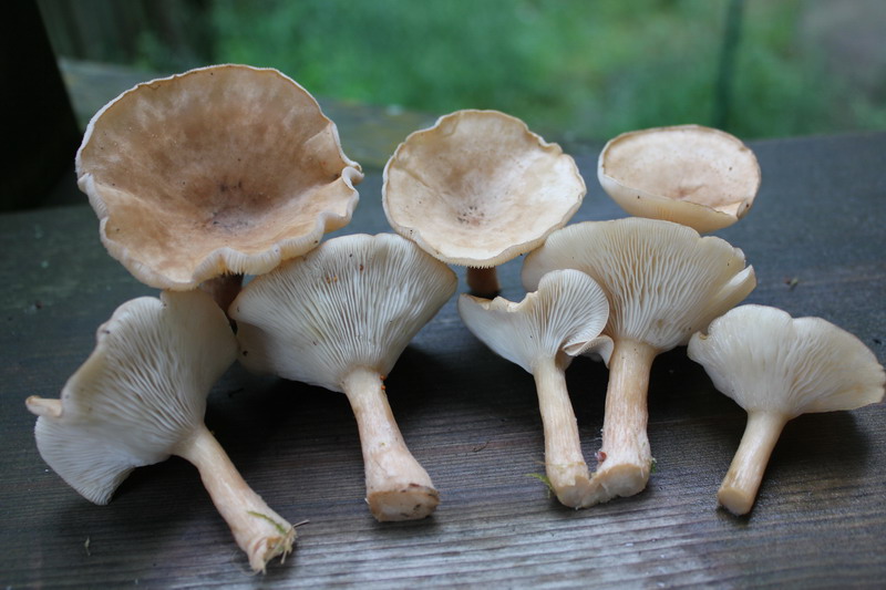 Der Tichterling (Foto oben) ist sehr wahrscheinlich der nach Blausäure riechende Infundibulicybe gibba, bis vor kurzem noch Clitocybe gibba, also der Ockerbraune oder Gelbbraune Trichterling. Über diesen lange als durchweg essbar geltenden Trichterling haben sich in den letzten Jahren Meldungen von Unverträglichkeiten gehäuft. Generell warne ich vor Trichterlingen; sie zu speisen kann bedeuten, Russisch Roulette zu spielen.