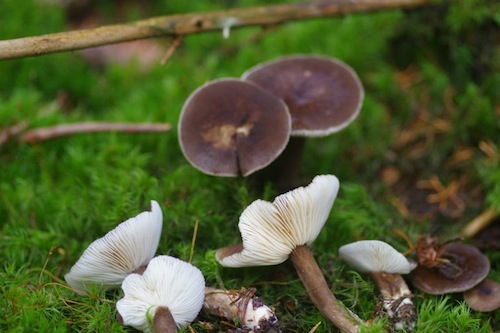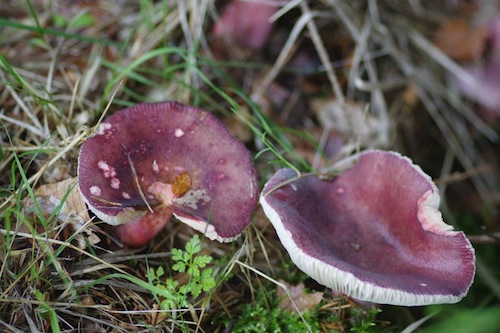 Foto: Zwei Stachelbeertäublinge (Russula queletii). Sie sind unerträglich scharf und riechen nach Stachelbeerkompott. Das Artepitheton geht zurück auf den französischen Pilzkundler Lucien Quélet.