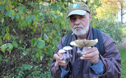 Foto rechts: ... die Violetten Rötelritterlinge, die er hier ins Bild hält. Zusammen mit Büscheligen Raslingen sowie herrlichen Samtfußrüblingen, die ihm seit Jahren ein Eschen-baumstumpf beschert, hat er am Freitag und Samstag (23./24. November 2012) fast drei Kilo bester Speisepilze gesammelt.