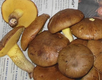 Foto: Eine wahre Röhrlingsparade! Wir sehen links oben Raufußröhrlinge, Mitte oben Rotkappen, rechts einen selbstbewussten Steinpilz, darunter eine Horde Goldröhrlinge und links unten Körnchenröhrlinge.