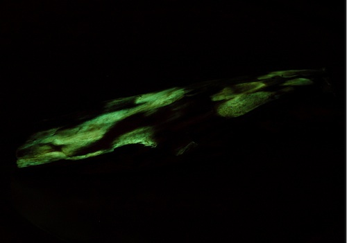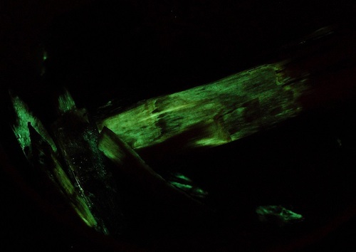 Foto: Das Myzel (Wurzelgeflecht) des Hallimasch leuchtet das vermodernde Holz, in dem es siedelt, grün fluoreszierend aus. Den Vorgang, dass der Hallimasch aus sich selbst heraus leuchten kann, also kalte, nicht brennbare Energie in Form von Licht entwickeln kann, nennt man Biolumineszenz. Nur 71 von gut 100.000 Pilzarten sind biolumineszent.