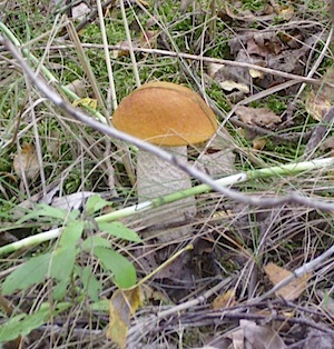 Foto rechts: Eine Espenrotkappe mit schöner Musterung am Stiel im besten Alter wartet auf Rolf. Seit Anfang, Mitte August findet er an seinen Ernteplätzen zuverlässig schönste Rotkappen. (2 Fotos © Rolf)