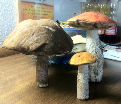 Foto: Eine gewiss spannende Perspektive bietet sich diesen beiden Rotkappen und einem Raufußröhrling auf dem Küchentisch. Wo sonst Gräser, Kräuter und hin und wieder ein Fröschchen das Pilzleben unterhaltsamer gestalten, tragen hier Telefon, Cola und Fanta sowie eine Lebensweisheit zur Kurzweil bei. Aber die Pfanne wartet schon.