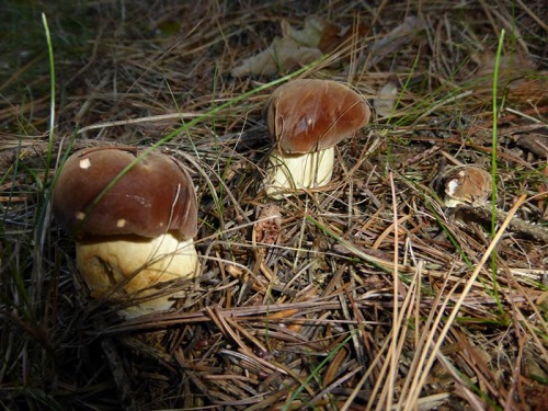 Foto: Drei Maronenröhrlinge drängen sich auf engem Platz. Ihre Begleiter sind, man erkennt es an den Nadeln, Kiefern.
